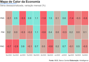 A produção industrial avançou levemente em outubro (+0,1%). Já o varejo restrito voltou a recuar na margem (-0,3%), juntamente do volume de serviços, que recuou pelo terceiro mês consecutivo (-0,6%).